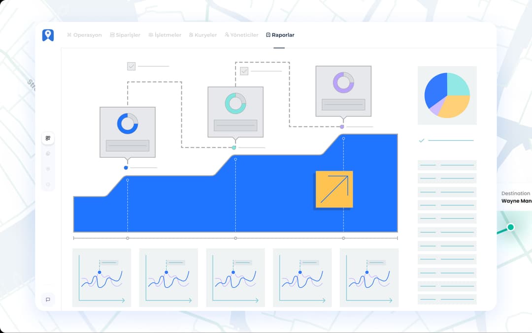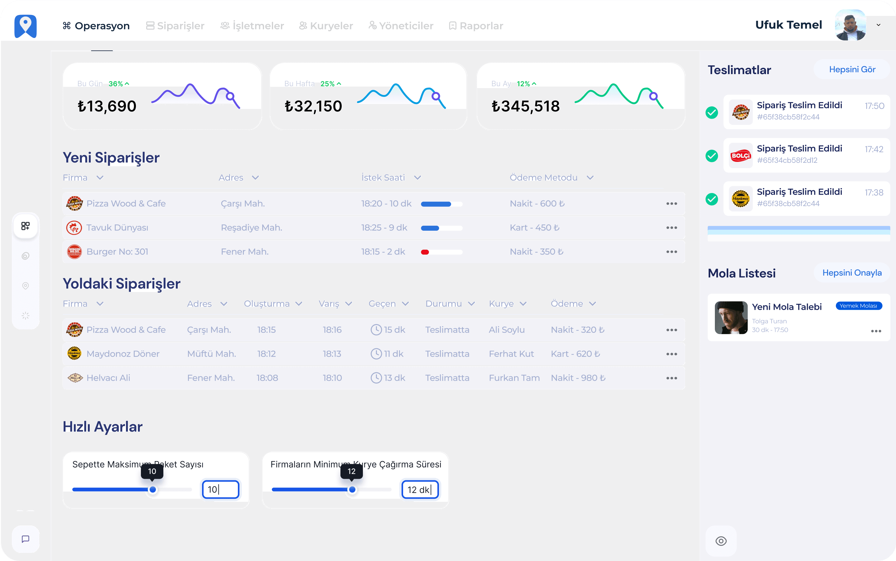 Paket teslimatında şeffaflık ve kontrol sizde! Kuryelerinizin gerçek zamanlı harita üzerinden konumlarını takip edebilirsiniz. Bu sayede: Olası gecikmelerin veya aksaklıkların önüne geçebilir, proaktif çözümler üretebilirsiniz. Takip sistemini de biz yazdık :)